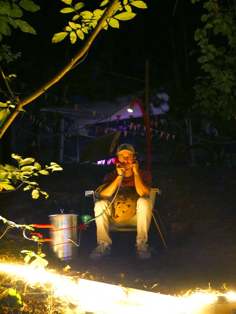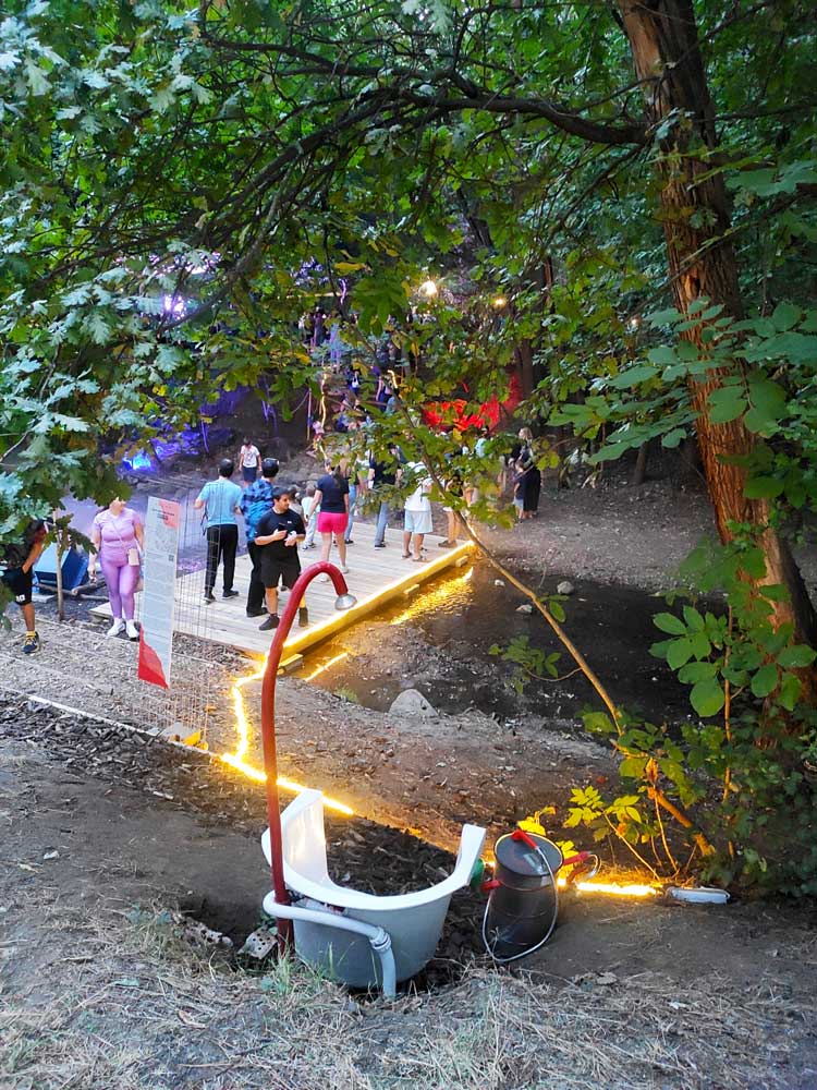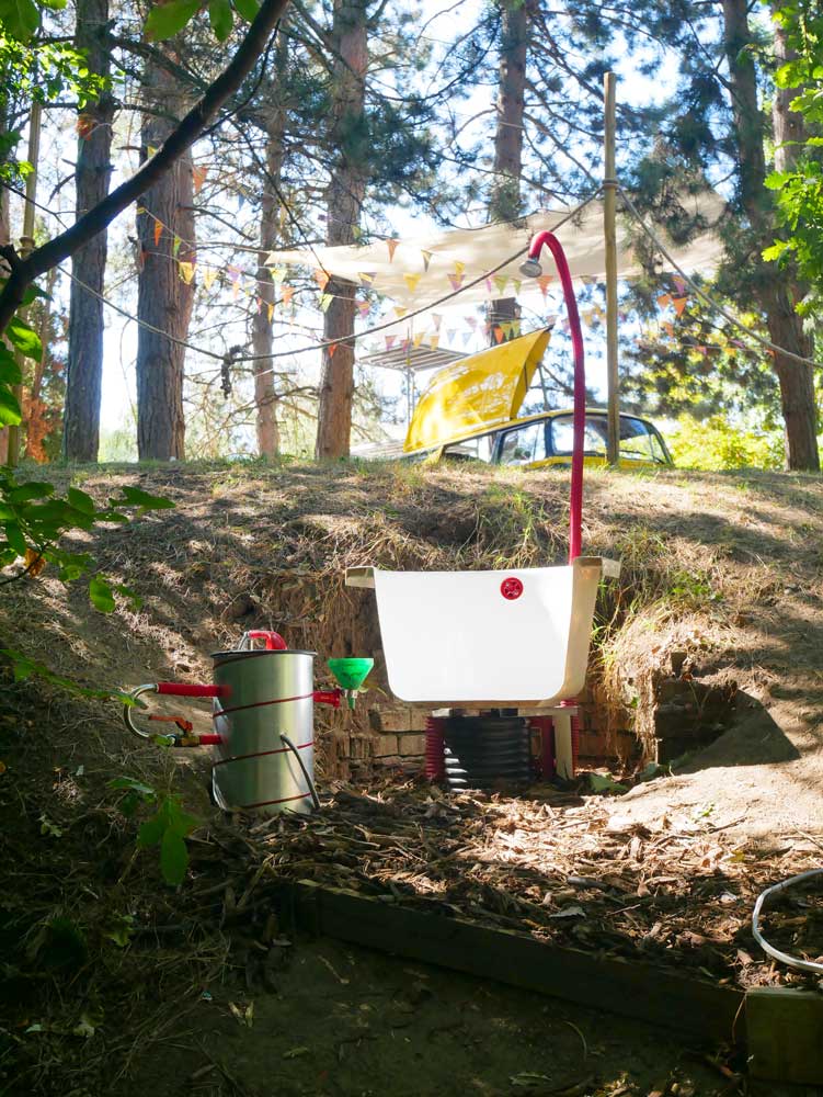 A Bathtub with a View creates the atmosphere of a living room of bathroom relics: a cut bathtub turned into an armchair, a mounted showerhead lamp, and a flexible “showerhead phone”. Built from found objects, the structure directly faces the old sewage across the river. When seated, visitors can observe the red-lit sewage pipe discharging into the river. Picking up the showerhead, they hear a recorded audio documentary describing the function and role of pipes in past civilisation. The speaker is hidden inside the showerhead and the documentary is narrated by a deep male voice.